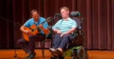 Rullstolsburen pojke följer med pappa upp på scen – öppnar munnen och golvar alla