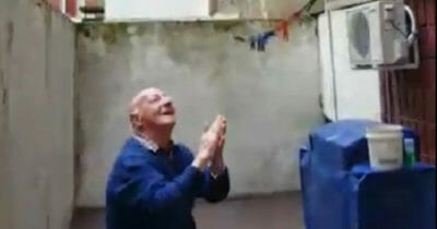 Video: Gammal man som bor ensam fyller 95 år – brister i tårar när grannarna sjunger från balkongen