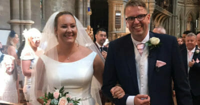 Rullstolsburen brud är fast besluten om att gå fram till altaret – här reser hon sig i kyrkan
