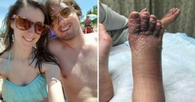 Paret märker att fötterna ändrar färg och form efter romantisk strandpromenad