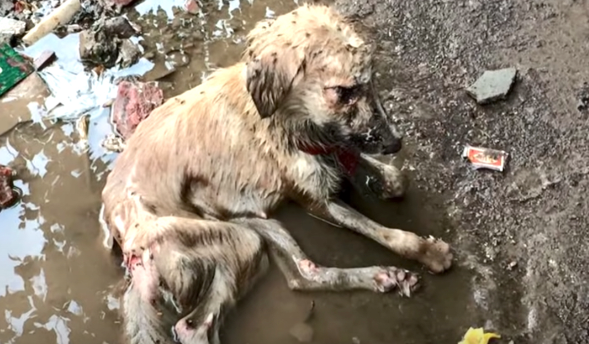 Nyligen sågs en hund ligga hjälplös och avmagrad i en lerpöl fylld av skräp i Indien.