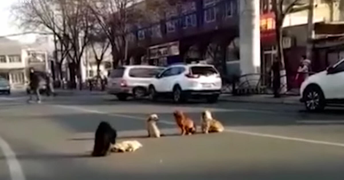 Fyra hemlösa hundar sågs sitta mitt på en väg i Kina. De personer som såg detta måste ha undrat vad fyra hundar hade att göra mitt på en trafikserad väg.