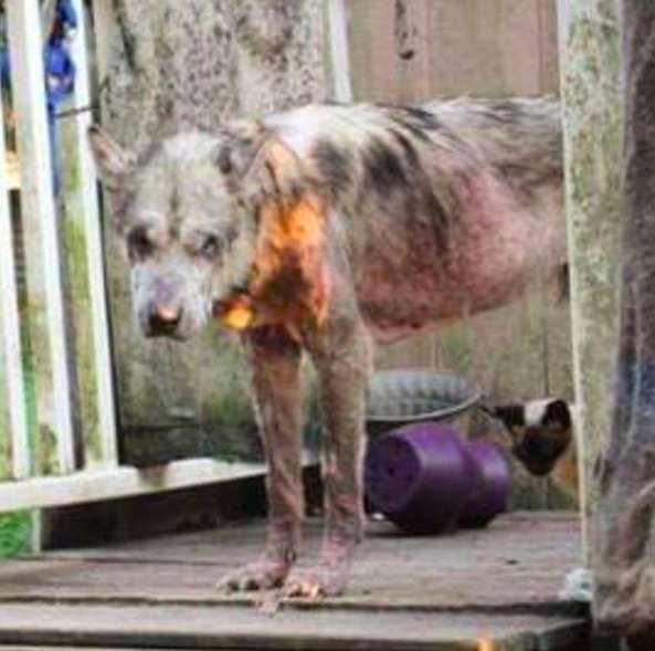 Den stackars hunden hade varit fastkedjad och ignorerades. Han var i fullständigt fasansfullt tillstånd när han plockades upp av räddningspersonal från Southern Pines Animal Shelter och Southern Cross Animal Rescue of Mississippi.