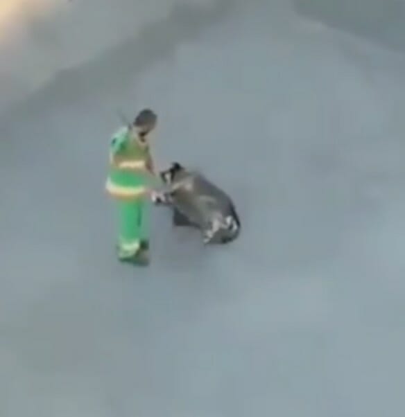 Plötsligt tog han en liten paus från sin vardagliga tjänstgöring – och närmade sig sakta den snälla hunden. Han gick mot hundens rygg med sin sopkvast i högsta hugg, skriver The Dodo.