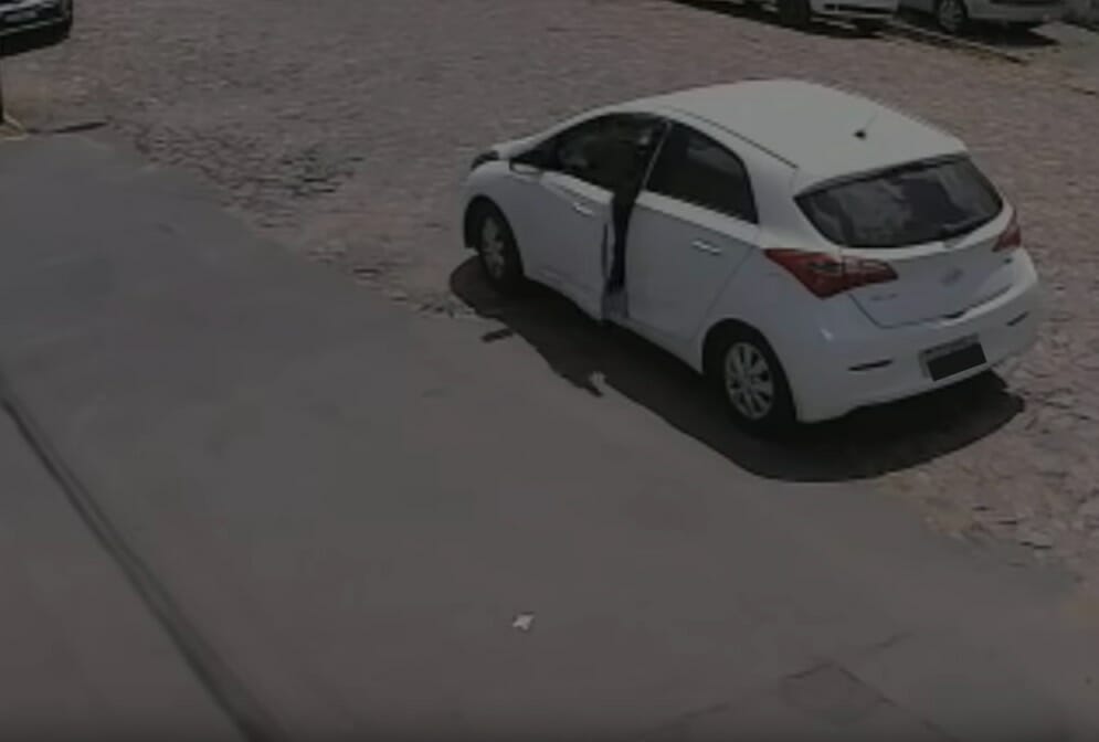 Det är från staden Sao Leopoldo i södra delarna av Brasilien som ett videoklipp från en övervakningskamera nu sprids. En kvinna kan stanna med sin bil på vad som tycks vara utanför en kontorsbyggnad, enligt Daily Mails uppgifter.