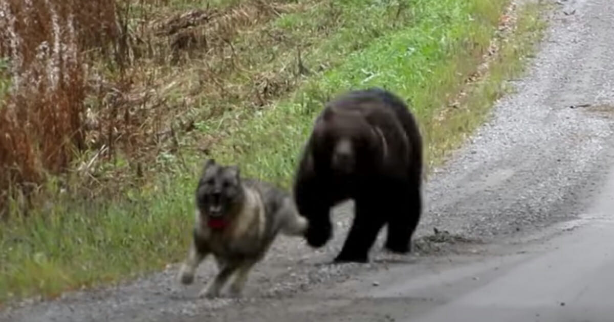 Vid en första anblick måste det ha varit jättesvårt för hundens ägare att se om denna stora vildbjörn agerade aggressivt – eller om den bara ville leka med hunden.