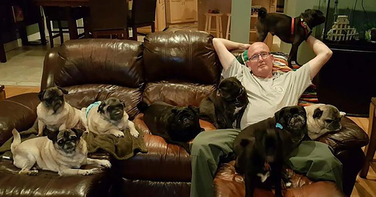 Bridget är itne den första hunden han räddat. Han är aktiv i en lokal djurorganisation som heter Hound in Pounds och har för närvarande åtta små hundar hemma som han tar hand om.