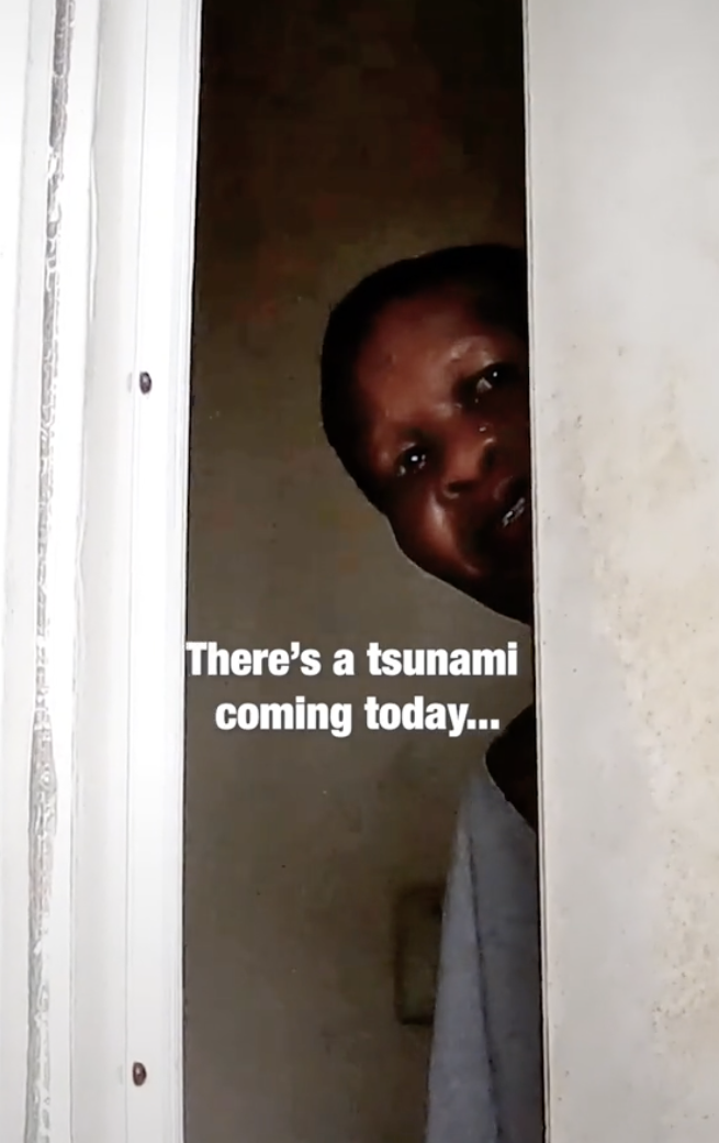 ”Har du hört nyheten? En tsunami är påväg”, säger han till mamman i familjen.