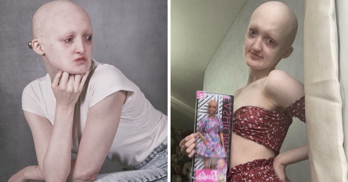 ”Jag kommer ihåg att jag grät när jag var liten eftersom jag inte hade något hår. Jag var så avundsjuk på andra barn men nu har jag helt accepterat att jag är flintskallig. Det är stärkande”.