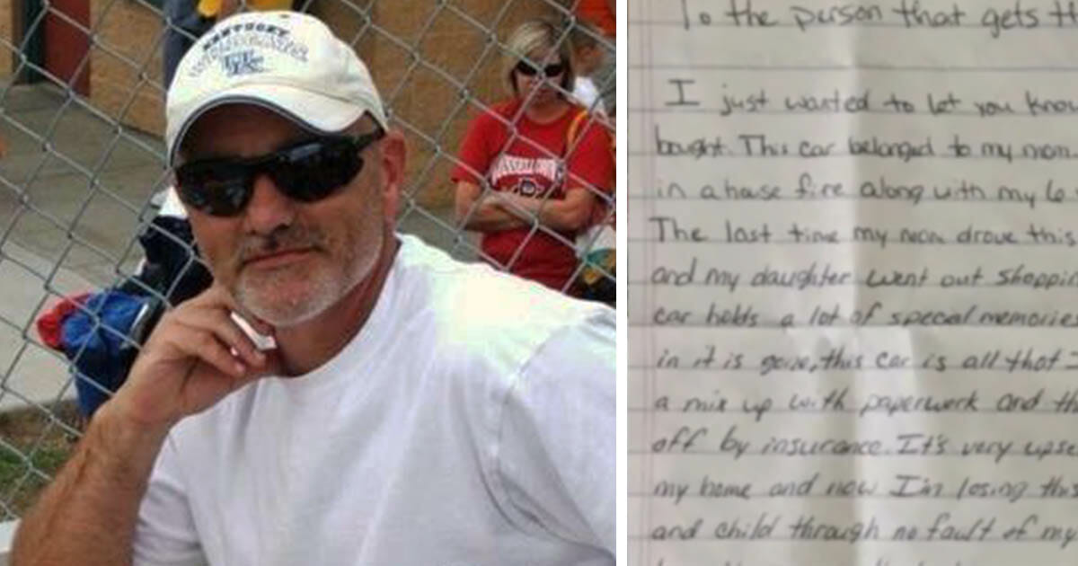 ”Till personen som köpt den här bilen, jag ville bara berätta för dig vilket specialfordon du har köpt. Den här bilen tillhörde min mamma. Hon dog 25 februari 2015 i en husbrand tillsammans med min 6-åriga dotter och min moster.
