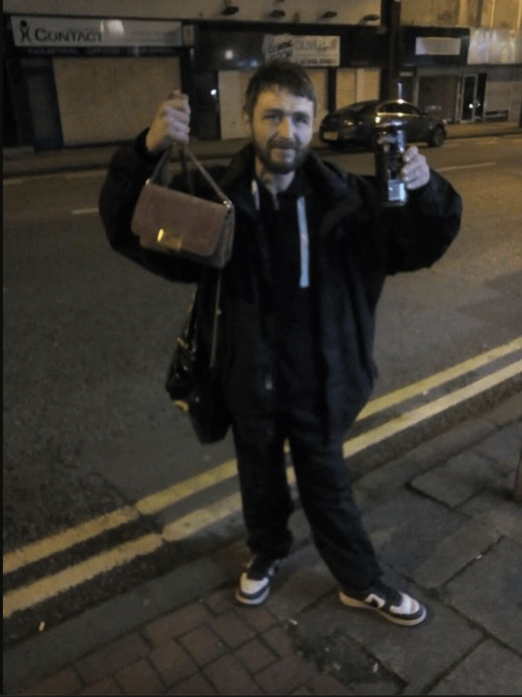 En hemlös man vid namn Paul hade hittat hennes väska utanför baren som hon var på, och han hade hållit den i tryggt förvar.