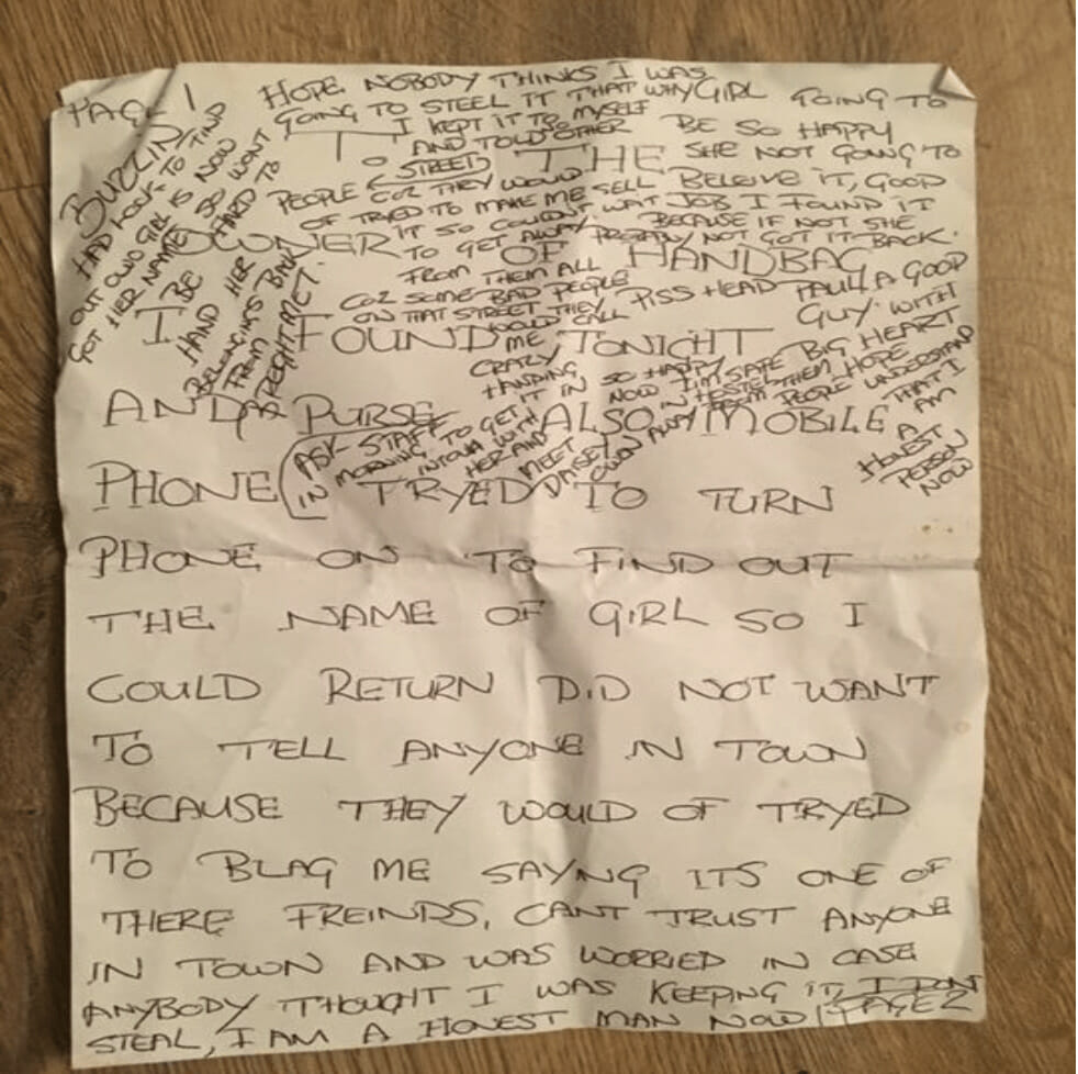 Men Paul förstod också att det kunde se misstänksamt ut: en hemlös man med en kvinnas handväska. Han ville inte att någon skulle tro att han snott den, så han skrev ett brev för att förklara situationen.