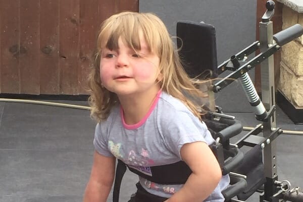 Hon kan heller inte gå, men tack vare en speciell gå-vagn kan hon gå några steg själv.