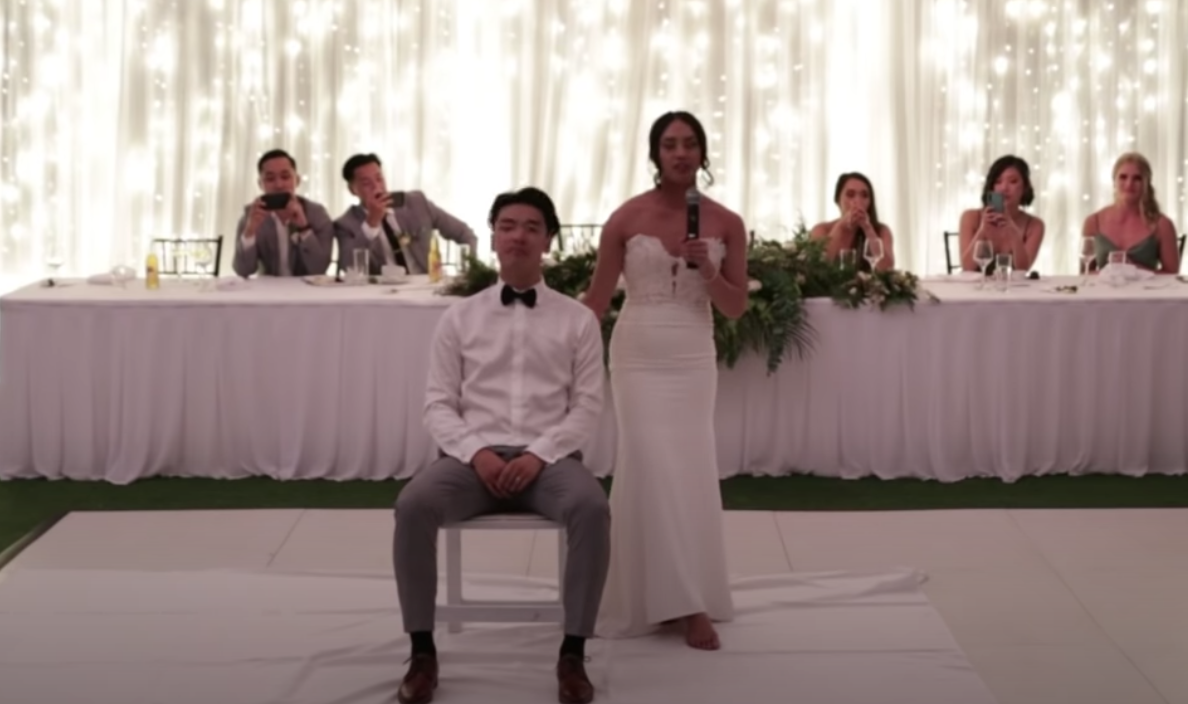 När det var dags för paret att dansa den traditionella bröllopsvalsen pausar DJ:en musiken för att berätta något.