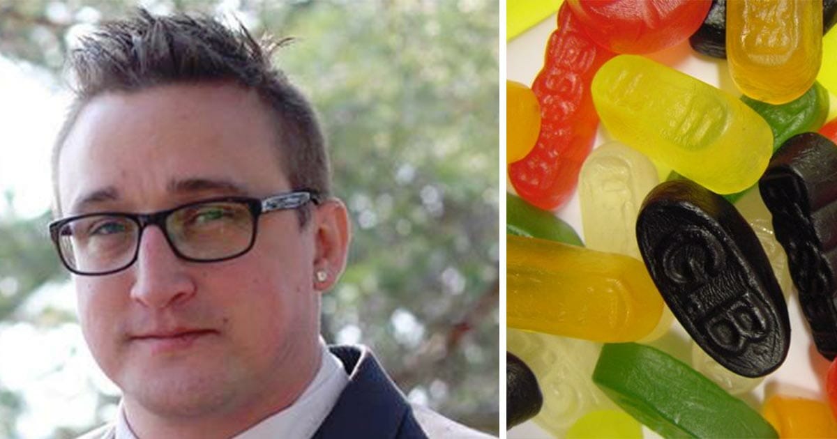 När Joachim Heidkamp tittade närmare på de vingummin som fyraårige sonen plockat gjorde han en märklig upptäckt. På varje godisbit stod namnet på en alkoholsort.