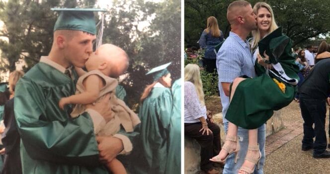 Nu – 18 år senare – var det i stället pappas tur att gratulera dottern på examensdagen. Och för att göra det hela lite extra speciellt, passade de på att återskapa den där bilden som togs 18 år tidigare. På Twitter har Tori delat med sig av de fina sekvenserna, där pappan håller upp dottern och ger henne en puss.