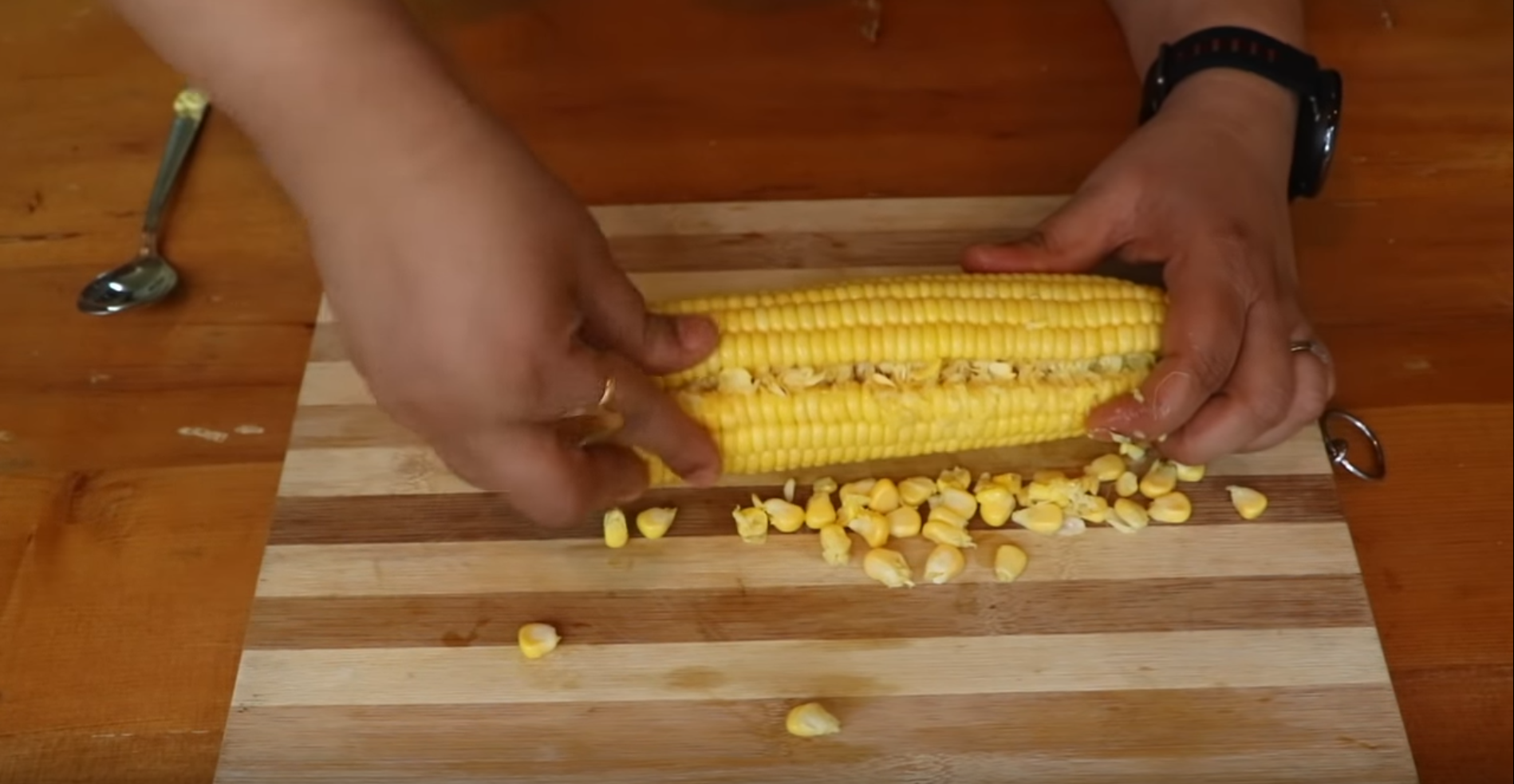 Använd fingrarna för att pressa ned majskornen mot den redan tomma raden. Foto: Youtube/Something’s cooking with alpa