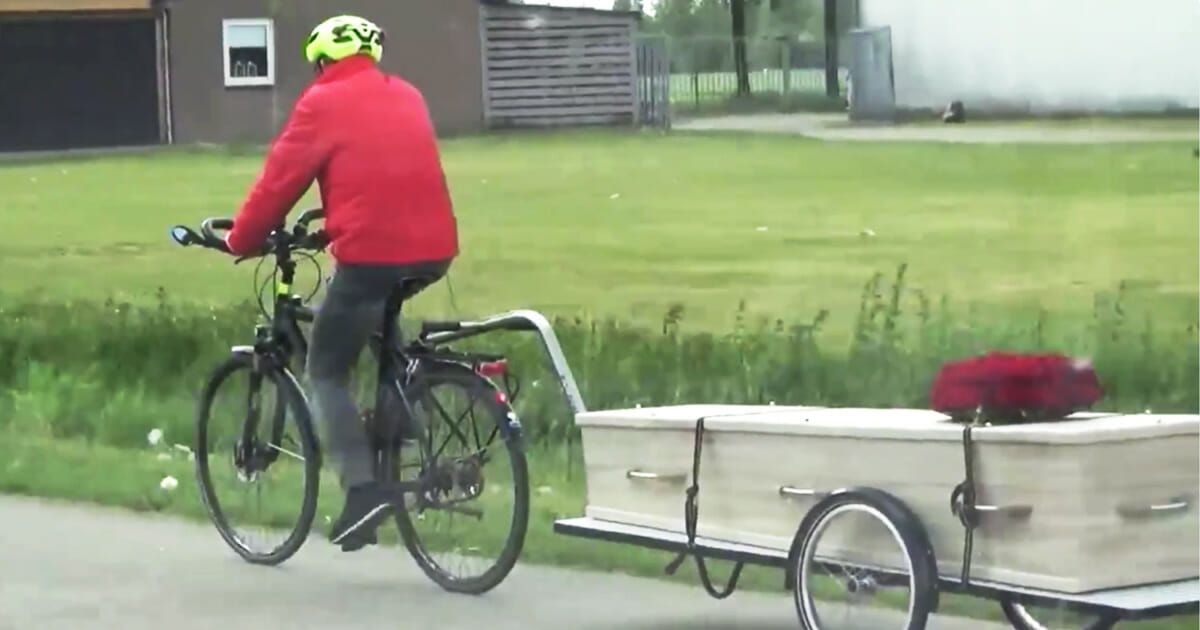 Bilderna som publicerats i Algemeen Dagblad berör tusentals människor. De visar den 69-årige cyklisten Ad Verhoeven som cyklar över den nederländska landsbygden. Bakom sig har en ett släp med en kista dekorerad med rosor. Där i ligger hans avlidna hustru.