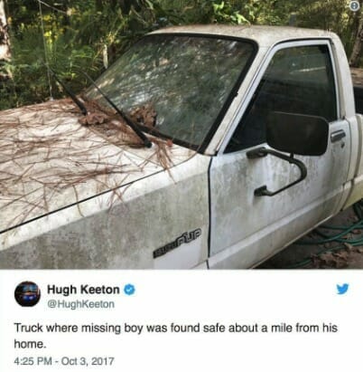 Då såg Blake en pojke sitta bakom ratten, och han ropade genast på sin farbror. Inne i bilen satt den gråtande William, som alla var ute och letade efter.